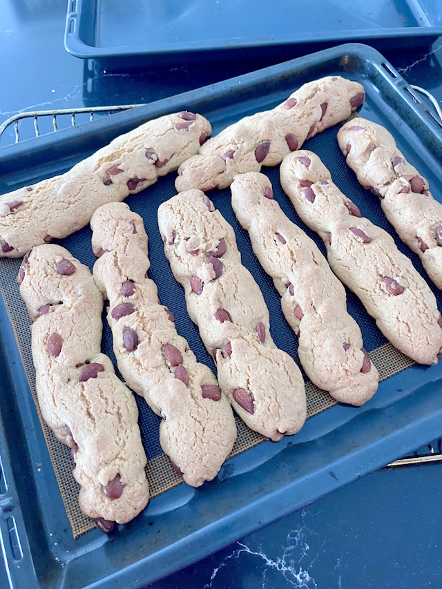 Una volta trascorsi i 25 minuti, affettarli, meglio se di sbieco. Rimetterli sulla placca del forno con il taglio rivolto verso l’alto e infornare di nuovo a forno ventilato a 180° fino a quando prenderanno un bel colore brunito.