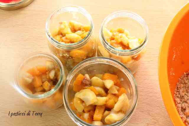 Riempire i vasetti per 3/4 con la zucca e le castagne,