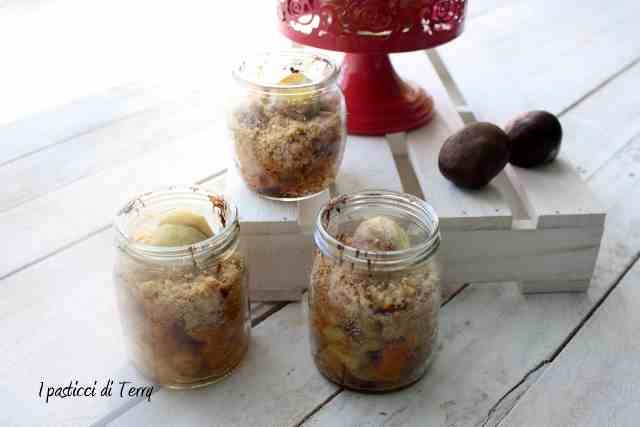 e saltarla in padella con una noce di burro, il miele e le castagne, anche loro a tocchi. Cuocere per 6/7 minuti, tenendo girato. Accendere il forno a 180°. Intanto in una ciotola unire lo zucchero, il burro e la farina. Lavorare velocemente con la punta delle mani, fino ad ottenere un composto sabbioso.