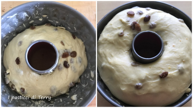 Ora imburrare lo stampo e cospargerlo con le mandorle affettate. Pirlare bene il panetto, arrotondandolo, come si fa comunemente con il panettone. Con le dita, formare un buco al centro e sistemarlo nello stampo. Coprire e lasciar lievitare, deve arrivare a superare il bordo dello stampo.