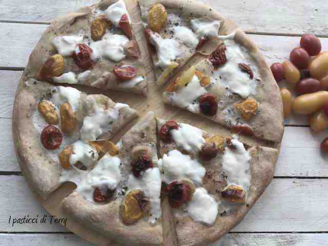 Ho scelto questa Pizza diversamente Margherita, dove nell’impasto c’è il grano arso che dona quel sapore di affumicatino che a me piace tanto. L’ho poi condita non con salsa o pomodoro in pezzi, come faccio di solito ma con tanti pomodorini gialli e rossi, per dare una nota di colore diverso. Per completare il tutto ho condito, verso fine cottura con dell’ottima mozzarella di bufala, stracciata con le dita. Vi assicuro una vera goduria!