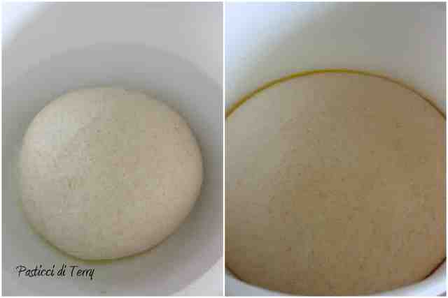 il giorno prima, sciogliere il lievito nell’acqua. Aggiungere quindi le farine e il sale. Impastare tutto fino a ottenere un panetto sodo e morbido. Mettere in una ciotola leggermente oliata e far partire la lievitazione. Dopo un oretta circa ho messo la ciotola in frigo, fino al giorno dopo.
