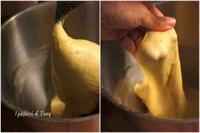 Una volta raffreddato l’impasto metterlo nella ciotola dell’impastatrice e far girare al minimo, con il gancio. Unire lo zucchero ai tuorli e girare con un cucchiaino. Unire alternando questi tuorli e la farina, cercando di non perdere l’incordatura. Unire ora la crema di arancia, mischiata alla vaniglia. Ora il sale e infine il burro a pezzettini, sempre senza perdere l’incordatura. Per ultimo l’acqua, una goccia alla volta.