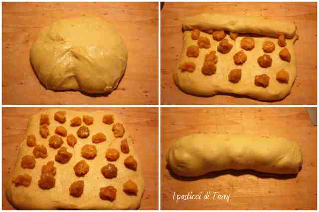 Rovesciare l’impasto sul piano e lasciar riposare un ora circa, scoperto. Ora girare su se’ stesso l’impasto e allargarlo. Sistemare la marmellata congelata e arrotolare l’impasto.