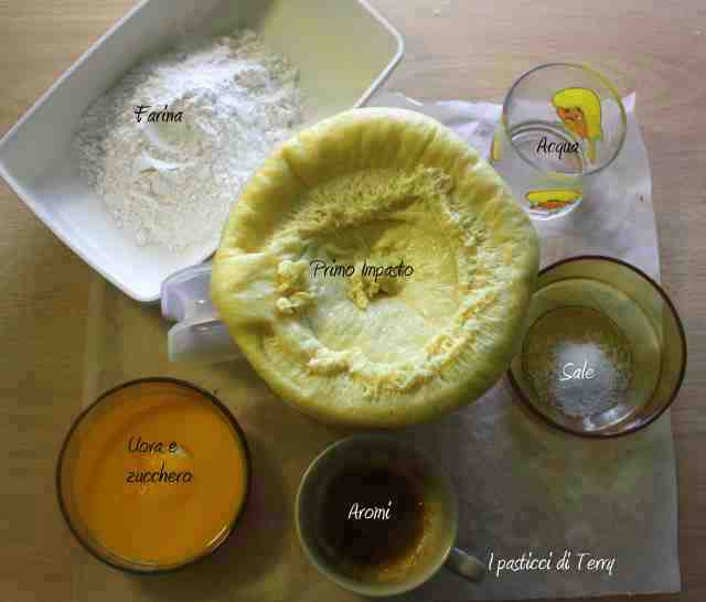Sciogliere lo zucchero nell’acqua, mettere nell’impastatrice, con la frusta K, unire la pasta madre, cercando di farla sciogliere. Ora unire la farina e aspettare che incordi. Aggiungere i tuorli, piano piano, aspettare che incordi. Cambiare la frusta e mettere il gancio, lasciare che l’impasto salga sul gancio e unire il burro, poco alla volta.