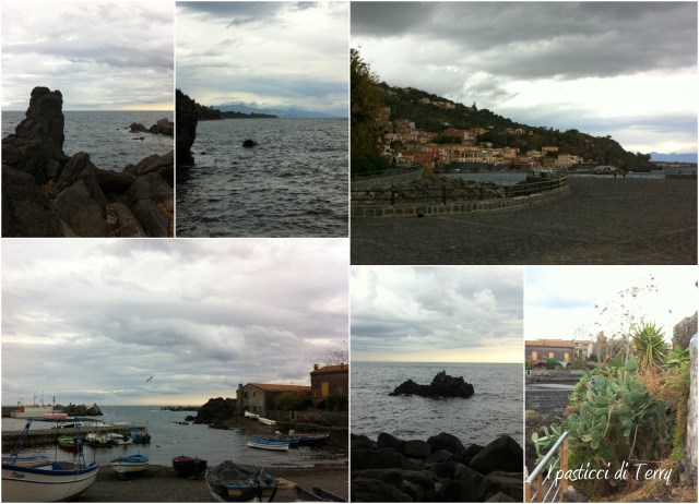 Infine il mare … il mio meraviglioso mare. Io adoro il mare, in tutte le stagioni. Credo che ogni stagione ha il suo fascino e anche in una giornata così grigia, guarda che meraviglia di colori. La costa è con rocce laviche, dovute alla vicinanza dell’Etna, il gigante buono. Che ogni tanto sbuffa ma loro ci convivono bene. Era già tutto innevato ma non ho pensato a fare una foto della cima, che si vedeva da casa di Patty.