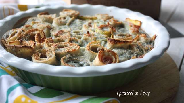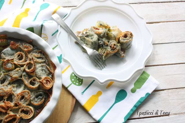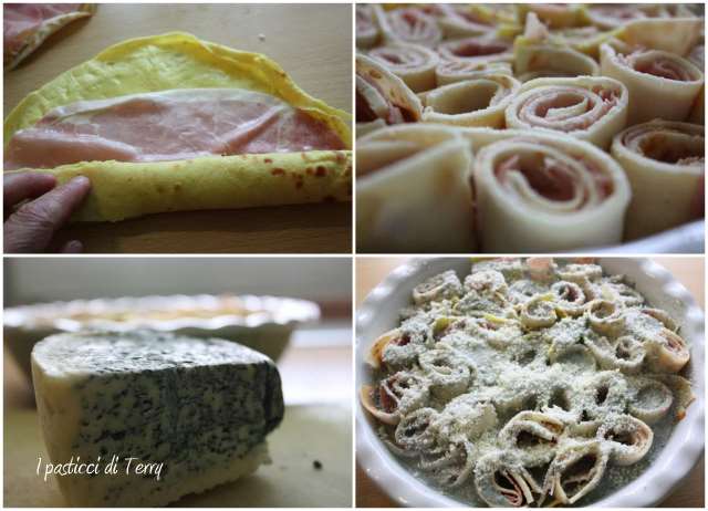 Stendere le Creps e posizionare sopra una fetta di prosciutto ogni creps. Girarla su se stessa, formando un rotolino. Tagliare a tocchetti (io ho tagliato a misura della teglia che ho usato). Posizionare questi tronchetti in piedi sulla teglia.
