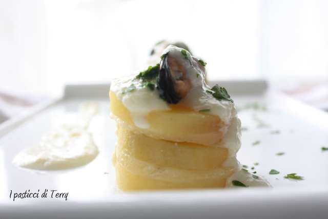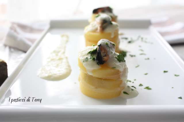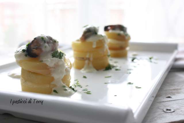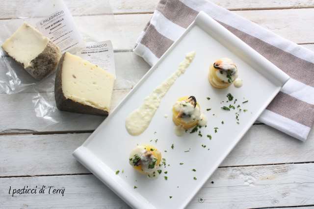 Per l’antipasto ho preparato delle Torrette di patate, alternate a fettine di Fior di Mugello, con una fondutina di Gran Mugello e cozze. Eccole qua: Torrette di patate e formaggi del Mugello.