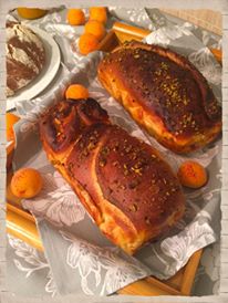 Treccia albicocca di AlInfine questa con spennellata di burro, ciocco fondente 72%, uva passa e granella di mandorle siciliane