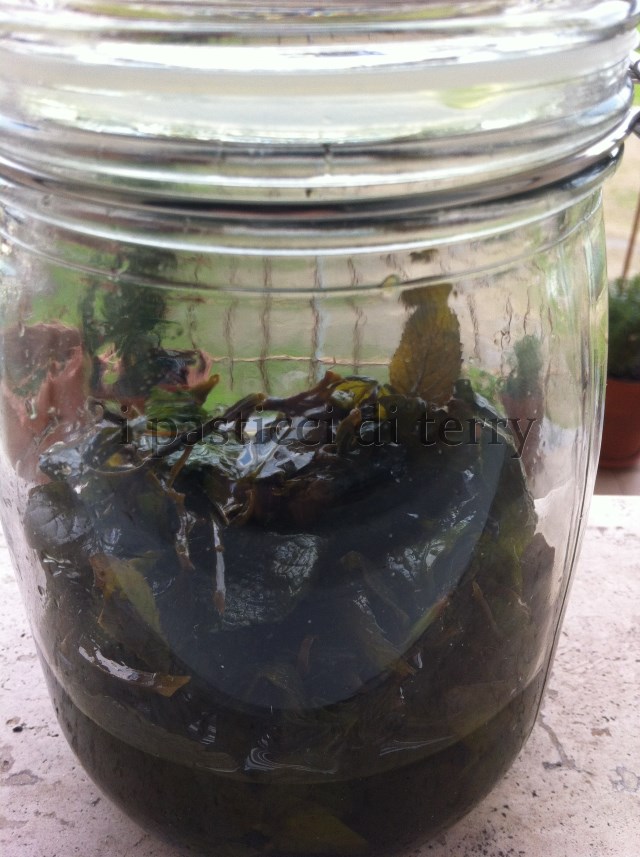 Ho scaldato 150gr dell’acqua prevista, l’ho lasciata raffreddare e ho aggiunto l’alcool, la menta e l’anice. Ho lasciato macerare per una settimana, agitando ogni giorno.