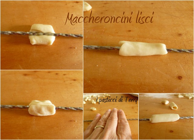 Passato il tempo, prelevare un pezzo di pasta, formare un rotolino, largo più o meno come un dito mignolo piccolo. Tagliare con un tarocco dei pezzetti, lunghi circa 1 cm. Arrotolarli nell’apposito ferretto. Se non avete il ferretto la vedo dura … non so se si vendono nei negozi di articoli casalinghi. Il mio apparteneva alla mia nonna. Formare rotolando l’impasto sul ferretto, un maccheroncino e sfilarlo. Procedere fino ad esaurimento della pasta.