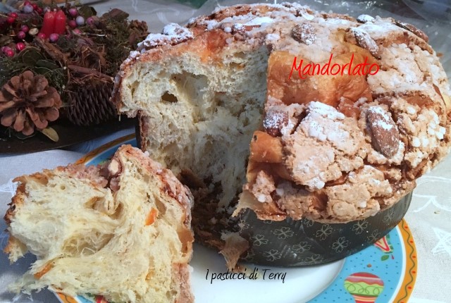 Questo è un Mandorlato, dolce natalizio alternativo per chi vuole variare dal Panettone. La ricetta base è più o meno la stessa del Panettone, aumenta la crema di arance, aumentano i canditi e si cosparge la sommità del dolce di glassa alle mandorle. Il sapore finale è di un dolce estremamente soffice e leggero, rispetto al Panettone. Il profumo di arance e mandorle è intenso e il mix dei due sapori molto goloso. Provatelo e poi mi direte se non ho ragione. La ricetta la copio da questa del Panettone, cambiando solo alcuni particolari, come detto sopra.