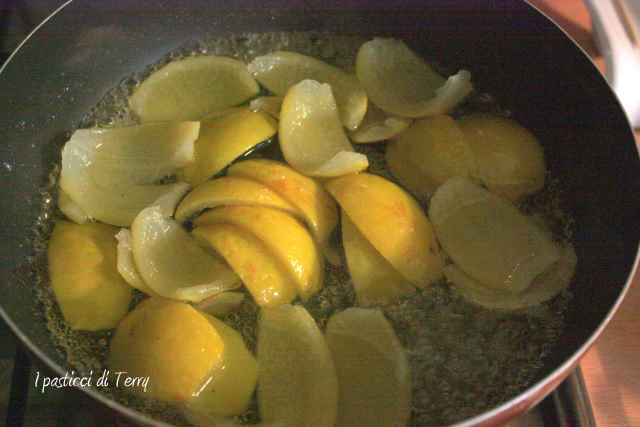 Per i canditi invece, mettere a bollire le scorze tenute da parte in acqua fredda. Dal momento del bollore calcolate circa 10 minuti. Scolare, mettere altra acqua fresca e ripetere l’operazione altre due volte. Ora pesare le scorze scolate e mettere lo stesso quantitativo di zucchero e acqua in una larga padella, dove le scorze ci stiano, senza sovrapporsi.
