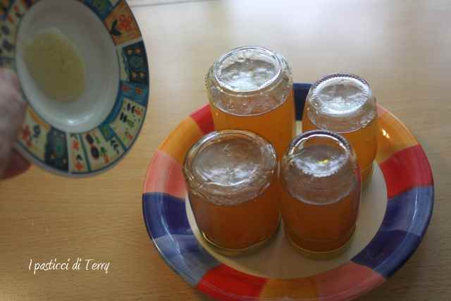 Fate la prova piattino; metterne un cucchiaino su un piattino, lasciar raffreddare e piegare il piattino. Sarà pronta quando non si muoverà. Altrimenti prolungate la cottura. Invasare subito, ancora calda, in vasi sterilizzati, tappare bene e girare a testa in giù, perché si formi il sotto vuoto. Lasciar raffreddare completamente, etichettare e conservare per qualche giorno, prima di utilizzarla.