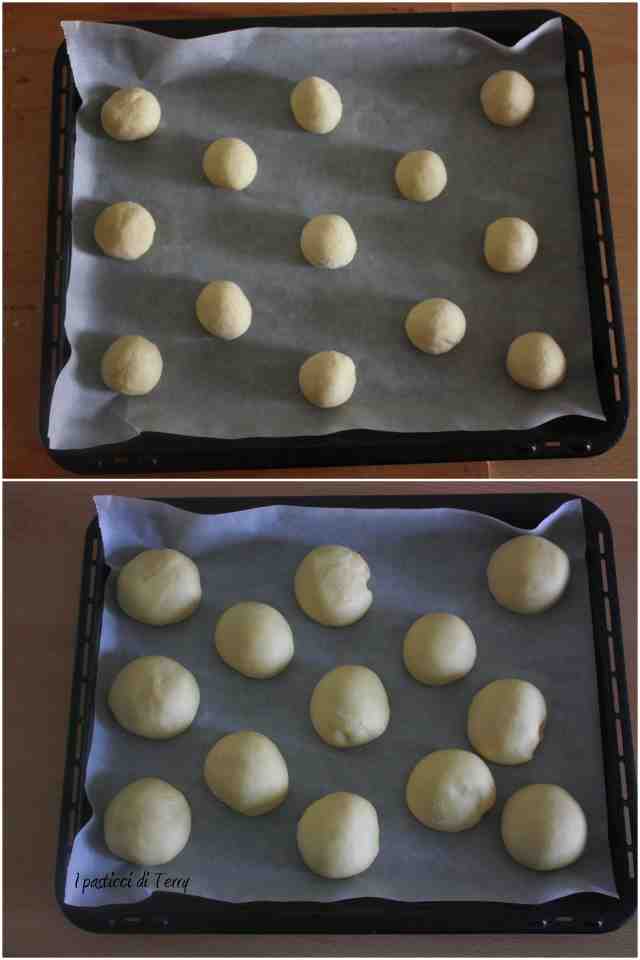 Togliere la ciotola dal frigo, far acclimatare e poi rovesciare l’impasto sopra il piano di lavoro, leggermente infarinato. Dividere in 12 pezzi uguali, saranno di circa 42 g cadauno.  Poggiare i Panini direttamente su carta forno, sulla placca. Lasciar lievitare fino al raddoppio. Spennellare con il latte e l’uovo e infornare a 180° per circa 15 minuti.