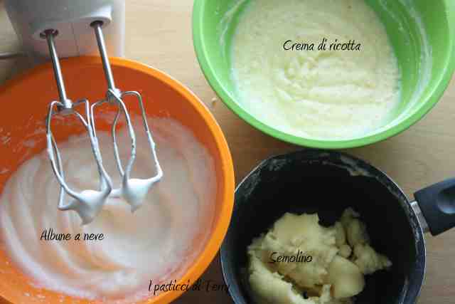 Preparare lo stampo, o gli stampini, come me, ungendoli con del burro. Accendere il forno a 170°. Dividere i tuorli dagli albumi e montare questi ultimi a neve. Lavorare a crema la ricotta con lo zucchero, aggiungere la scorza grattugiata di limone e arancio, a piacere. Io ho messo un cucchiaino della mia Crema di agrumi. Aggiungere anche i semini della bacca di vaniglia. Se ce l’avete aggiungere anche dell’acqua di fiori di arancio. Io non ce l’avevo e l’ho omessa. Aggiungere anche i tuorli e sbattere, usando delle fruste, fino ad ottenere una crema liscia.