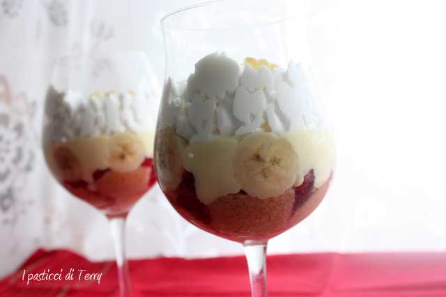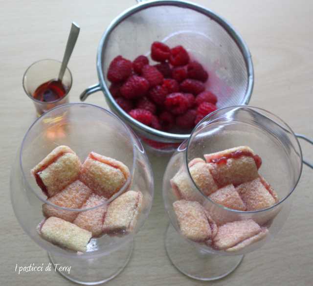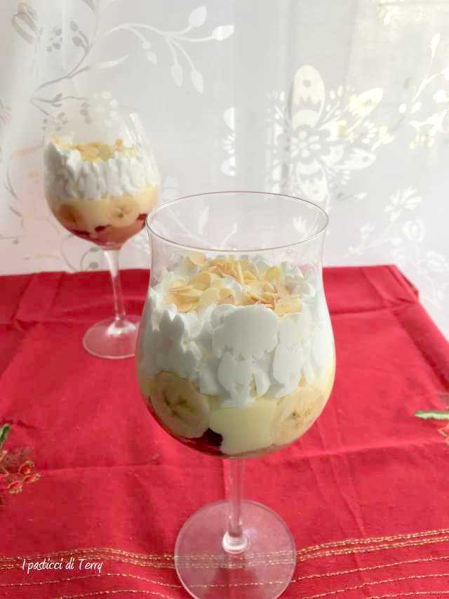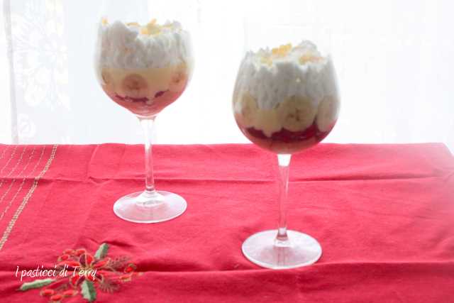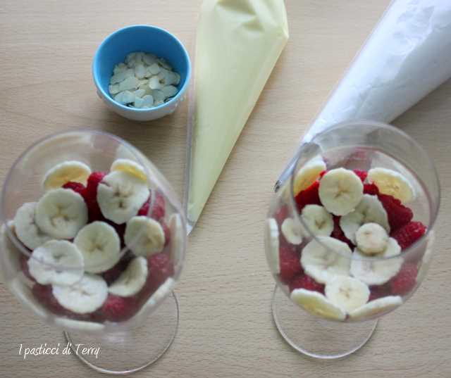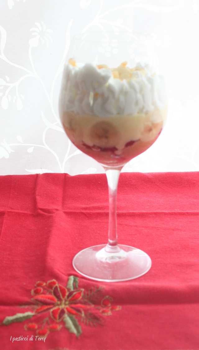 Io ho scelto questo, con i lamponi, la crema pasticcera, la panna ma anche mandorle, banana, liquore … insomma un bicchiere goloso ma anche veloce da fare. Può essere un idea anche per il dolce da servire nelle prossime feste di Natale. Preparare una grossa coppa è di sicuro molto più scenografico ma si puo anche optare per dei bicchieri singoli, come vi pare.