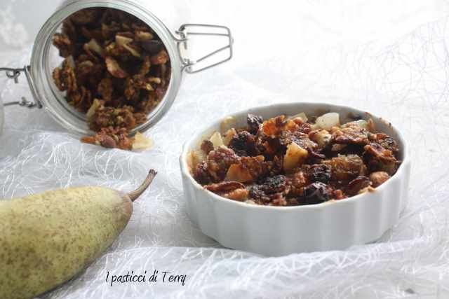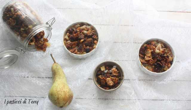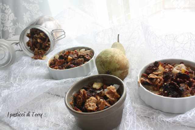 Ho preparato la granola qualche giorno prima. Poi sono stata presa dagli eventi influenzali che hanno colpito la mia famiglia (e infine me) e finito con le pere, solo alcuni giorni dopo. Quindi ci si può organizzare e fare tutto con calma.