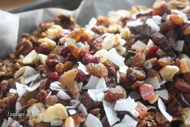 Negli ultimi 5 minuti tenere lo sportello a fessura, per far uscire bene l’umidità. Una volta raffreddata, frantumare grossolanamente con le mani e aggiungere la frutta secca e il cioccolato. Mischiare ancora e conservare in un barattolo.