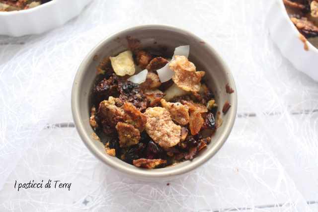 Non ho mai fatto la granola proprio perchè so che finirei per mangiarmela tutta a cucchiaiate dal barattolo, troppo pericolosa 😉 certo che mi piacerebbe però anche assaggiare una di queste cocottine, il morbido del ripieno si deve sposare meravigliosamente al croccante della granola. Una specie di crumble ma con la granola