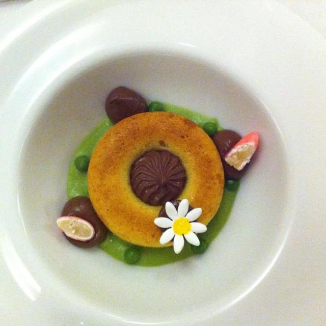 GnamBellina alle mandorle e olio extra vergine di oliva al profumo di limone, crema leggera alle mandorle e cioccolato al latte di soia su salsa di piselli e pistacchio di Rinaldini