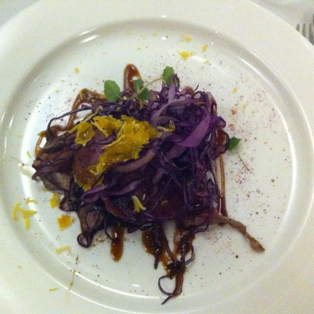 Millefoglie di noce di manzo fassone con cavolo cappuccio rosso, bottarga e riduzione di aceto balsamico di Tano Simonato