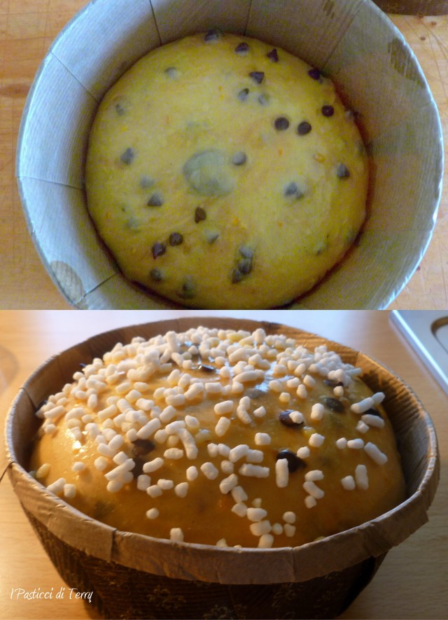 Quando ha raggiunto l’apice portare lo stampo a temperatura ambiente e fargli fare la pelle. Spennellare di burro fuso e decorare con zucchero in granella.