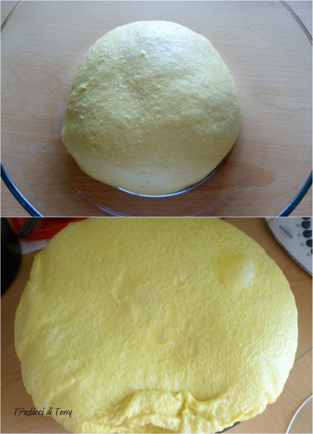 Trascorso questo tempo, ungere le mani e il piano di lavoro di burro, tagliare le quantità, a secondo degli stampi che si devono utilizzare. Poi arrotolare su se stesso, prima da un lato, poi girare di 90 gradi l’impasto e arrotolare di nuovo. Chiudere l’impasto a palla, vedrete che ha preso corpo e rimane compatto. Mettere nello stampo e fare lievitare, sempre a 28/30 gradi fino a quando l’apice raggiunge il bordo. Qui dipende, sapete benissimo che non posso darvi un tempo; diciamo che a me ci vogliono dalle 6 alle 9/10 ore, dipende dalla temperatura.