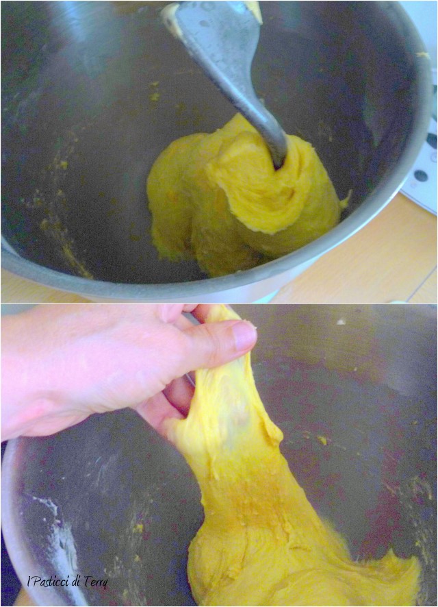 Quindi il burro, un pezzetto alla volta, la restante farina e infine gli ultimi tuorli, sempre poco alla volta.
