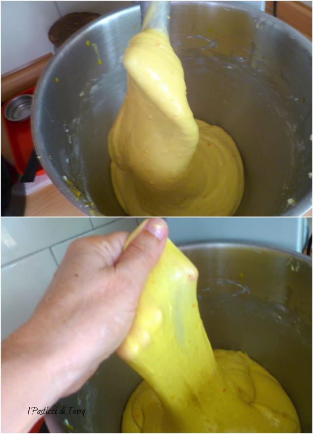 Aumentare ancora i giri fino a quando l’impasto si presenti bello lucido. Ci vorranno circa quaranta minuti dall’inizio. Negli ultimi 5 minuti cambiare la frusta e mettere il gancio. Raccogliere bene l’impasto con una spatola e fare la prova velo.