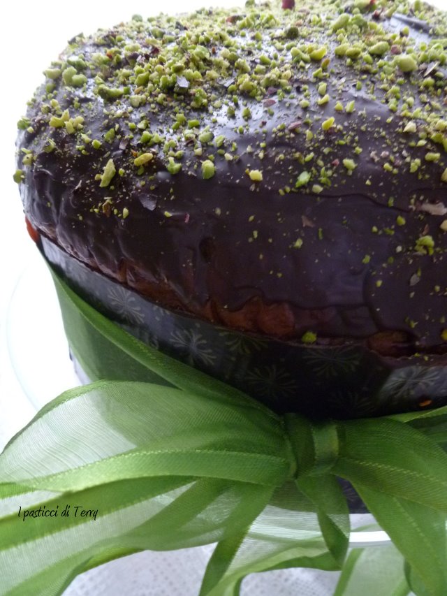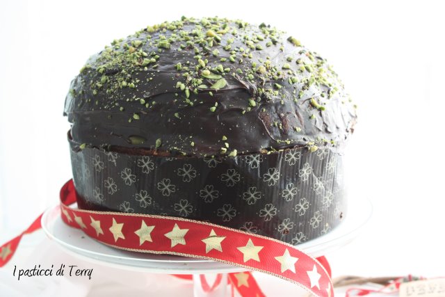 Far scaldare la panna e mettere dentro il cioccolato a pezzi. Sciogliere bene e amalgamare, spegnere il fuoco, lasciar raffreddare e colare sul panettone. Cospargere di pistacchi tritati.
