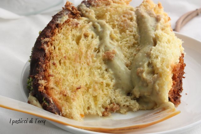Panettone con crema di pistacchio. Eccomi di nuovo a lunedì, dopo una settimana un pochino complicata, sotto il profilo della salute. Il mio Christian ha avuto la bronchite, con conseguente antibiotici e noi dietro con una forma di raffreddore e tosse, davvero tosta da smaltire. Alla fine, grazie a Irene, ho risolto con un cucchiaino di miele, con una punta di curcuma, presa mattina e sera. E’ bastata una giornata di questa cura e miracolosamente la tosse fastidiosa, che mi tormentava notte e giorno, si è dissolta. Ora sono ancora in fase espettorante ma ormai sto meglio.