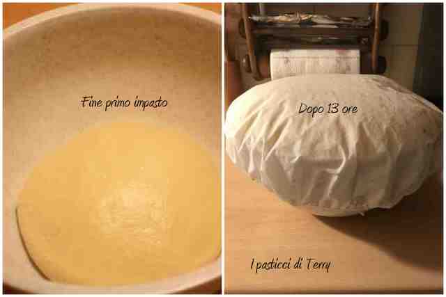 Dunque vi racconto cosa è successo a me. Il primo impasto si è svolto liscio come l’olio, impastato per circa 40 minuti, messo a riposo nel forno, con la luce accesa e triplicato in 13 ore. Poi messo in frigo, per circa un ora e proceduto al secondo impasto. Dopo aver aggiunto la farina e il malto l’impasto tendeva a rimanere troppo molle.