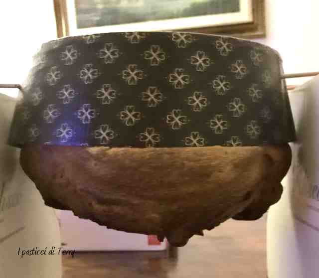 Appena tolto dal forno va infilzato alla base dello stampo con gli appositi aghi e ribaltato a testa in giù. Se non avete gli appositi aghi potrete usare due ferri da maglia. Lasciate raffreddare a testa in giù per circa 10/12 ore. Spruzzate un sacchetto apposito per alimenti di pochissimo alcool (quello per liquori, per intenderci), mettere dentro il panettone e aspettare almeno due o tre giorni, prima di aprirlo. Servirà a far amalgamare tutti i sapori e i profumi.