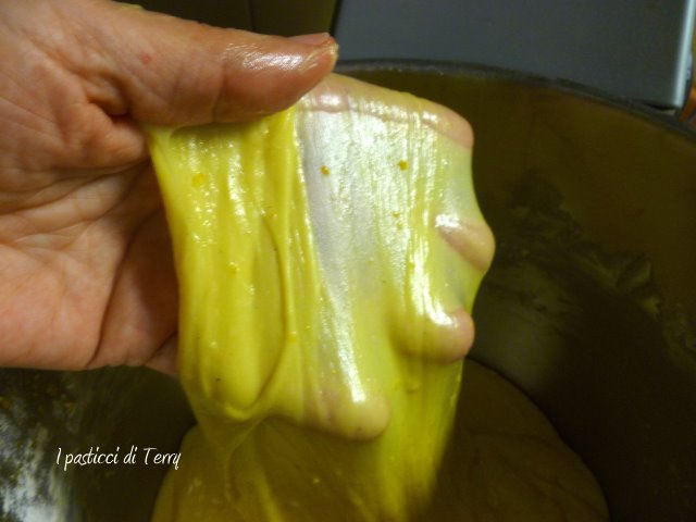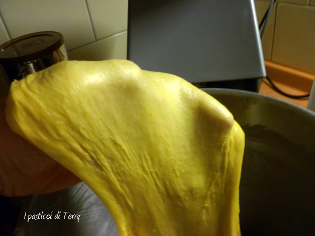Aumentare ancora i giri fino a quando l’impasto si presenti bello lucido. Ci vorranno circa quaranta minuti dall’inizio. Negli ultimi 5 minuti cambiare la frusta e mettere il gancio.