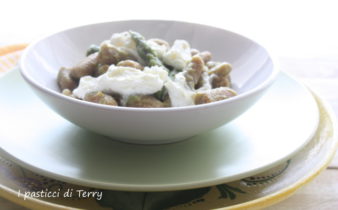 Gnocchi all’acqua con farina di zucca asparagi speck e stracciatella