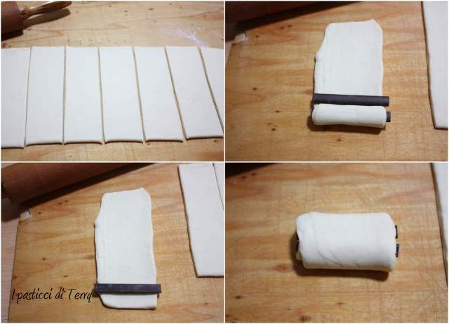 Invece per i nostri Pains au chocolat, tiriamo fuori la sfoglia dal frigo e tiriamo un rettangolo di circa 15×48. Qui i miei bastoncini di cioccolato erano da 8 cm anziché da 6, come consiglia Emmanuel, quindi il mio rettangolo era 15×64, di conseguenza più sottile. Vedete voi, a seconda di come sono grandi i vostri bastoncini di cioccolato. Dicevo preparate un rettangolo e dividete in 8 pezzi.