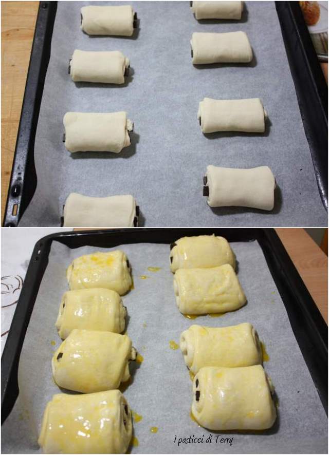 Spennellare i Pains au chocolat con l’uovo sbattuto con un pizzico di sale e infornare per circa 12/15 minuti. Devono dorare, senza colorarsi troppo.