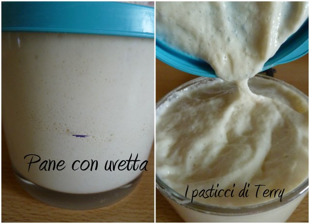 Mettere la farina setacciata nel boccale dell’impastatrice e sopra versare l’acqua, dare una girata veloce, coprire e lasciare in autolisi per circa un ora. Mettere a bagno le uvette in acqua leggermente tiepida per ammollarla. Io avevo rinfrescato il lievito liquido circa sei ore prima e lo avevo messo in frigo, indecisa su cosa farci, poi ho deciso di fare questo pane e l’ho tolto dal frigo quando ho messo la farina in autolisi.