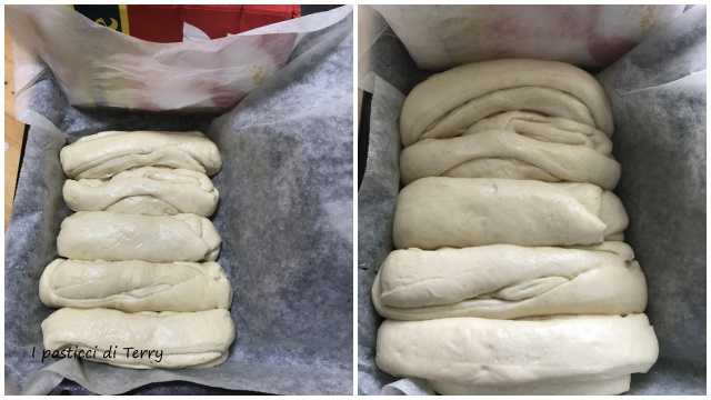 Ora tagliare in 5 o 6 parti uguale, arrotolare ogni singolo pezzo e posizionarlo sulla placca del forno, rivestita di carta forno. Bloccare i lati del pane ottenuto con dei pacchi di pasta o una teglietta rovesciata, per dare modo al pane di crescere solo in altezza. Lasciar raddoppiare.