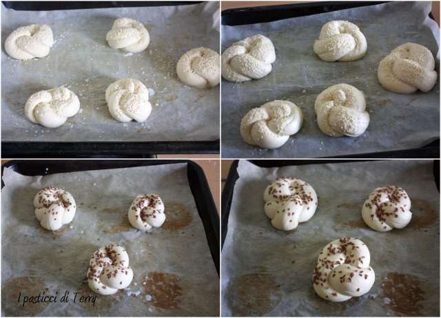 Posizionare i Nodi di pane su carta forno, direttamente sulla teglia che userete per cuocere. Spennellare con poco latte e cospargere di semini a piacere. Lasciar raddoppiare, a me ci sono volute altre due ore abbondanti nel forno spento, con la lucetta accesa, coperto con della pellicola.