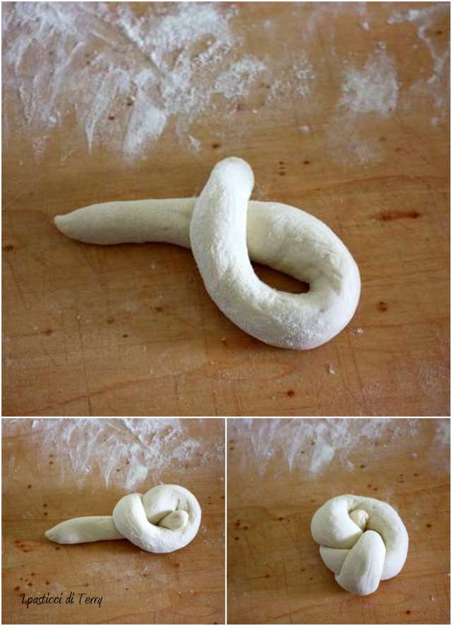 Mettere la ciotola in frigo per almeno 8 ore. Riportarla a temperatura ambiente, rovesciarla sul piano di lavoro infarinato e dividerla in dieci parti. Tirare dei filoncini con ogni pezzo di pasta e formare dei Nodi, facendo uscire un capo da sopra e mettendo il capo opposto sotto il panino, che si sarà formato.