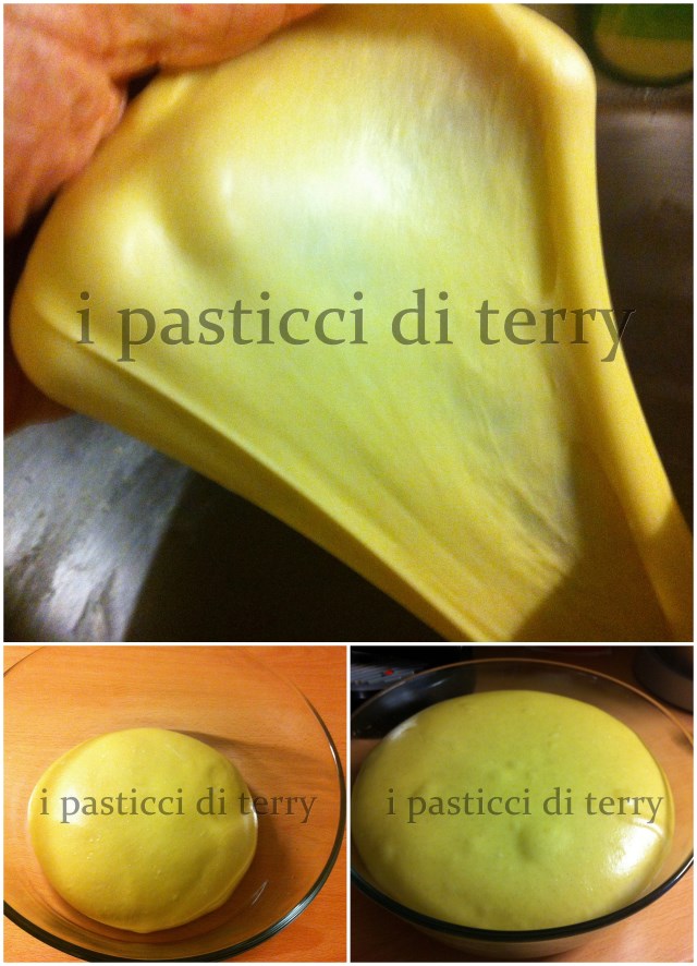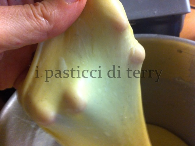 Aumentare ancora i giri fino a quando l’impasto si presenti bello lucido. Ci vorranno circa quaranta minuti dall’inizio. Negli ultimi 5 minuti cambiare la frusta e mettere il gancio.