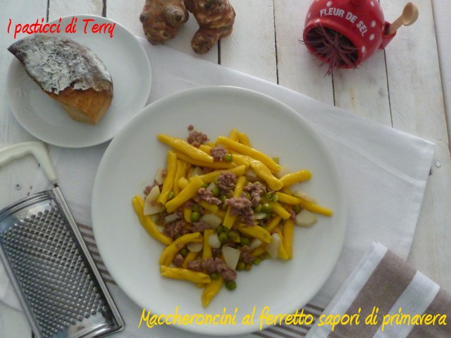 Quanto amo la Pasta fatta in casa ormai lo sai, la faccio sempre e mi piace anche cambiare le forme e, a volte, tentare anche forme nuove. Non è il caso di oggi. Questa è una Pasta al ferretto, con il mio ferretto di famiglia, regalo della mia mamma e prima ancora della mia nonna. Ho voluto arricchirla di zafferano, per darle un colore più marcato. E l’ho condita con dei Topinambur, che non avevo mai assaggiato in vita mia, mischiato a della salsiccia e a dei pisellini freschi. Per concludere ho voluto arricchirla di una bella grattugiata di Ricotta dura. Un formaggio buonissimo, dono della mia gemella, direttamente dalla Sicilia. Grazie Patty. ♥