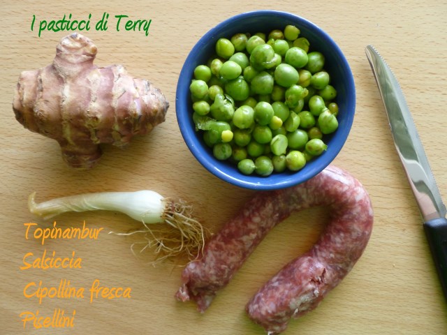 Affettare sottilmente la cipollina e farla rosolare in un giro di olio, in una larga padella, deve poi contenere la pasta. Aggiungere la salsiccia, privata della pelle, sgranarla e rosolarla bene. Pelare e fare a pezzettini il topinambur. Una volta rosolata la salsiccia, aggiungere il topinambur, i piselli e un bicchiere di acqua circa. Io non ho salato perché la mia salsiccia era già bella saporita. A fine cottura (ci vorranno circa 20 minuti) assaggiate e regolate eventualmente di sale.