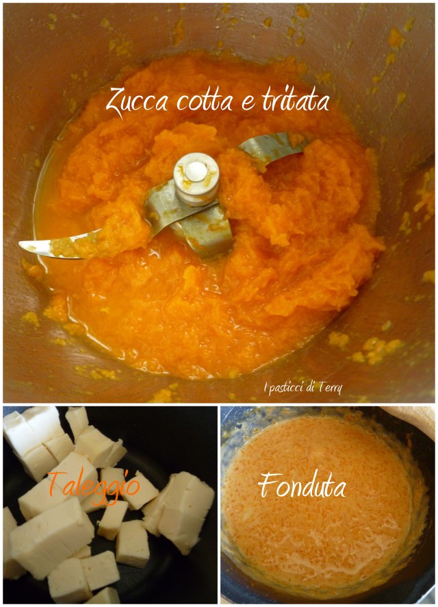 Intanto mettere la zucca, mondata e a pezzi, nel boccale del Bimby, Insieme a due cucchiai di latte, cuocere 15 minuti a 100°, a vel. 2. Quando la zucca sarà cotta, dare qualche secondo di turbo per frullarla per bene. Se non avete il bimby potete fare in una pentola o al forno o ancora nel micro onde, come preferite. Poi una volta cotta, passatela al mixer. Tagliare e pulire il taleggio e metterlo in un pentolino.