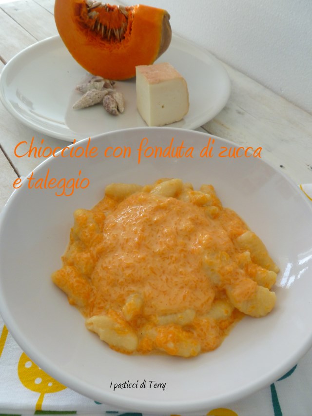 Cuocere le Chioccioline in abbondante acqua bollente salata. Al taleggio nella pentolina, unire la zucca. Girare su fuoco basso, formando una crema o fonduta. Regolare di sale. Condire le Chioccioline ben scolate, con questa fonduta e servire subito.