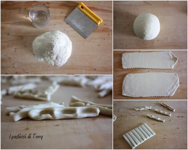 Miscelare le farine e impastare unendo l’acqua poco alla volta. Deve venire un impasto sodo e non appiccicoso. Lasciar riposare, coperto, per almeno 30 minuti.