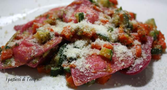 Carissima Terry ti faccio i miei migliori complimenti per questa originalissima idea che hai avuto: una pasta fresca contenente la barbabietola nell’impasto (e già questo la rende speciale;), un ripieno con ricotta di capra, leggera e gustosa, e un condimento a base di verdure che adoro:)). Infine, dei ravioli dalla forma veramente carinissima, molto adatti a questa ricorrenza.