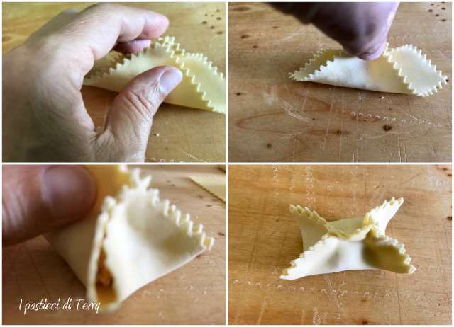 Sistemare un cucchiaino circa di ripieno, ogni quadratino. Unire i lati al centro, come in foto. Sembra complicato ma è semplicissimo. Sigillare bene i bordi e, se troppo asciutti, bagnare leggermente, prima di unire i lembi.